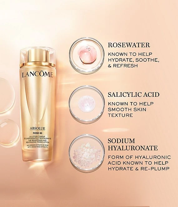 Formulated with a concentrated blend of 80% skin-soothing rosewater, sodium hyaluronate, and salicylic acid, Absolue Rose 80 is a face toner that revitalizes and brightens the skin. After one application, the skin is more hydrated and feels softer. In one week, the skin feels smoother and the complexion appears refreshed. Over time, skin texture looks refined and skin tone is visibly more even, bright, and luminous.