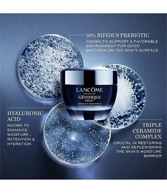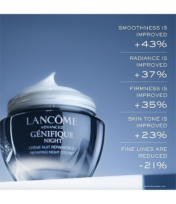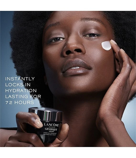 Advanced Génifique Repairing Night Cream works to restore hydration and plumpness while you sleep to wake up with skin looking radiant and well-rested. In a clinical study, 10 out of 10 women showed improved radiance. Over time, this anti-aging cream reduces the appearance of fine lines and wrinkles, leaving skin looking youthful and feeling healthy. Pair with Advanced Génifique Serum to strengthen the skin barrier and follow with the night cream to repair the skin barrier overnight.
